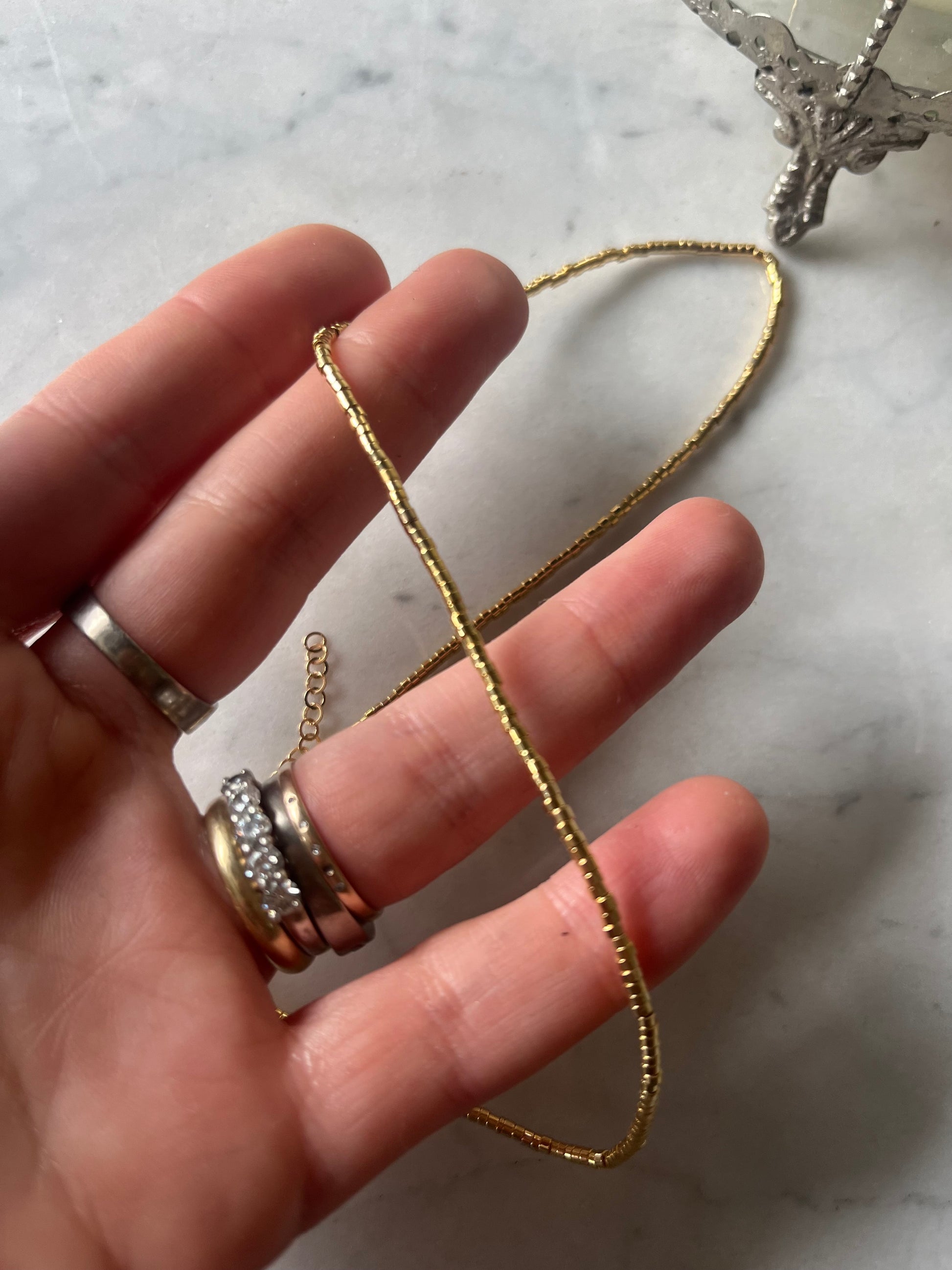 Cadena de 40 cm con baño de oro 24k, de diseño minimalista y elegante. Su acabado brillante la convierte en una pieza versátil, ideal para usar sola o combinar con dijes y otras cadenas. Perfecta para elevar cualquier look con un toque sutil y sofisticado.