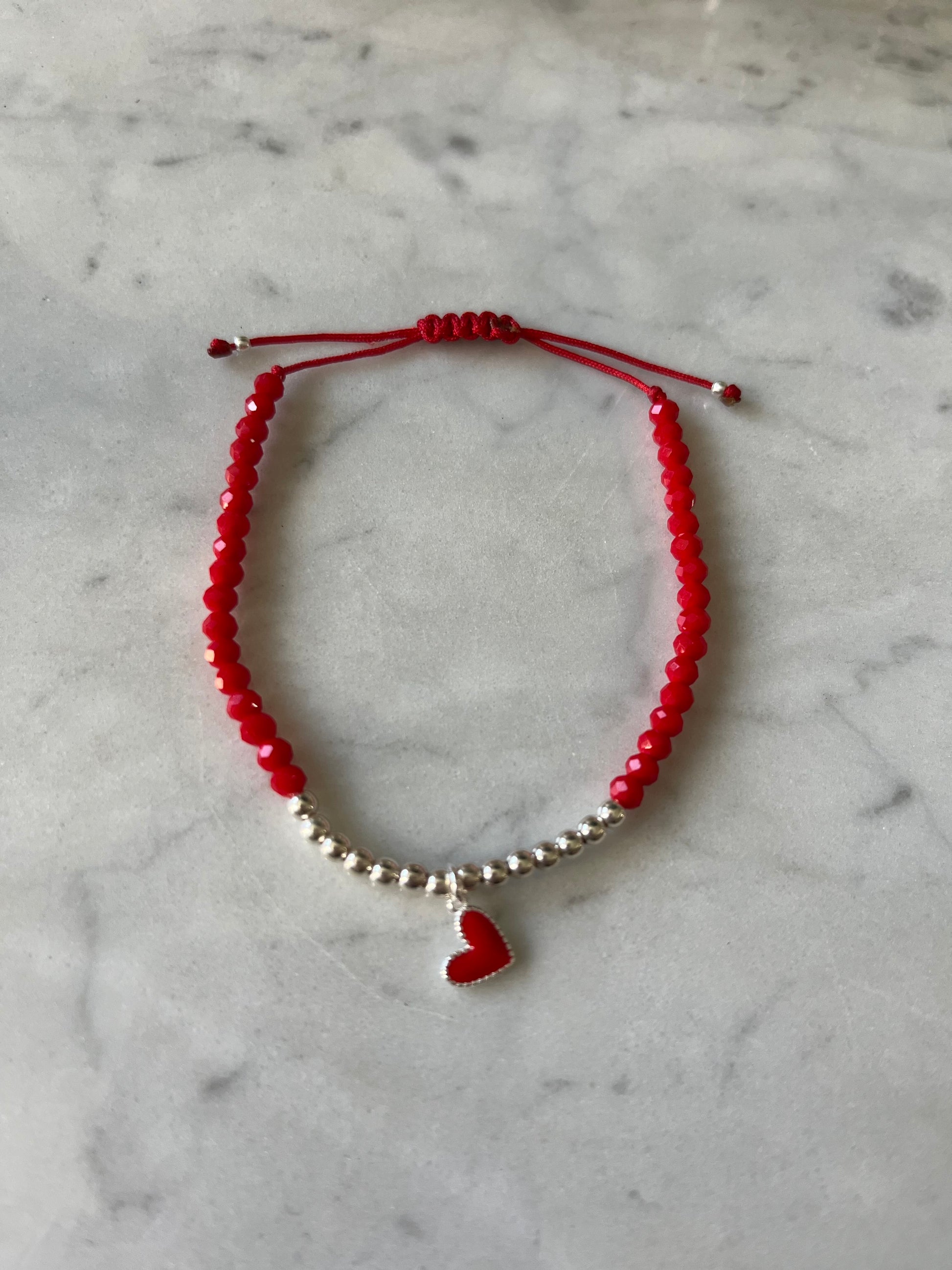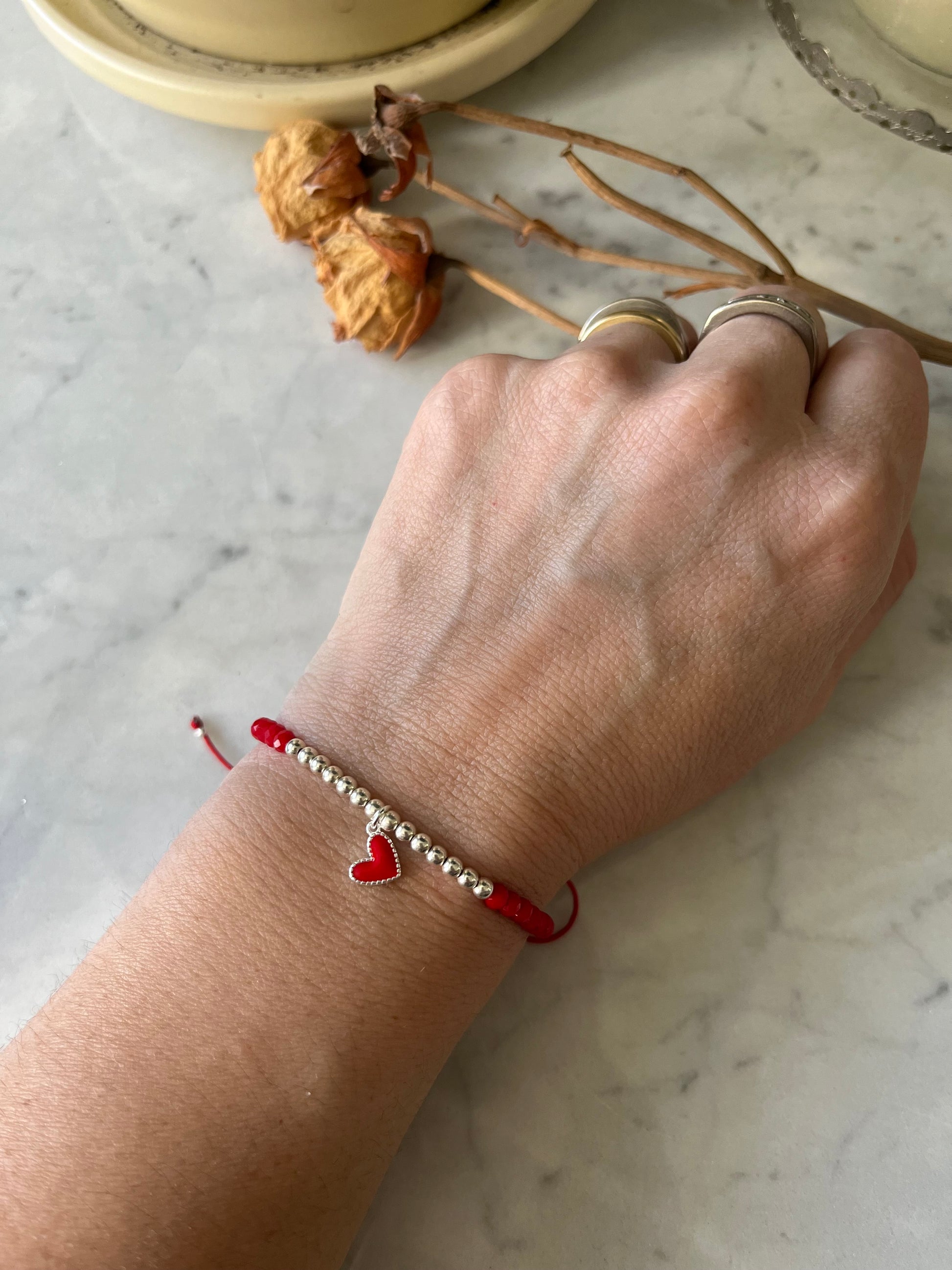 Pulsera de hilo rojo ajustable (15 a 20 cm) hecha a mano con cristales rojos, mostacillas de plata 925 y un delicado dije de corazón rojo en plata. El hilo rojo es un amuleto ancestral de protección contra el mal de ojo y las energías negativas, además de atraer buena suerte y fortaleza interior. El corazón simboliza amor, unión y conexión especial, convirtiendo esta joya en un accesorio significativo y protector. Ideal para uso diario o como regalo con intención