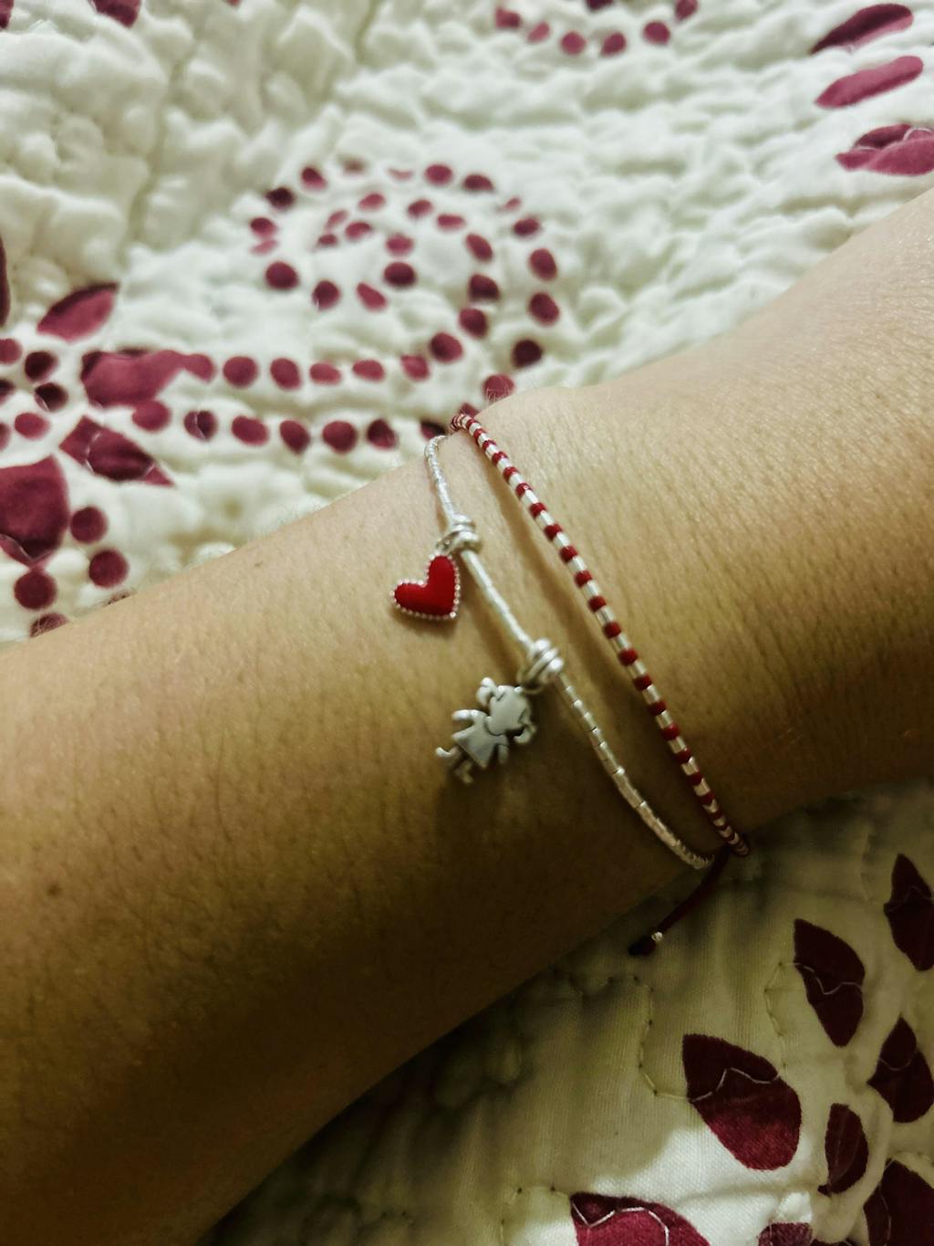 Pulsera ajustable de hilo rojo con mostacillas de plata