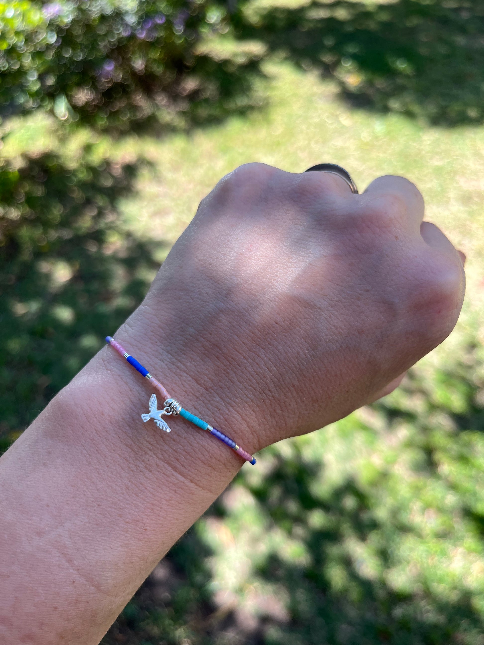 Pulsera hecha a mano con mostacillas multicolor que representan luz, esperanza y alegría.