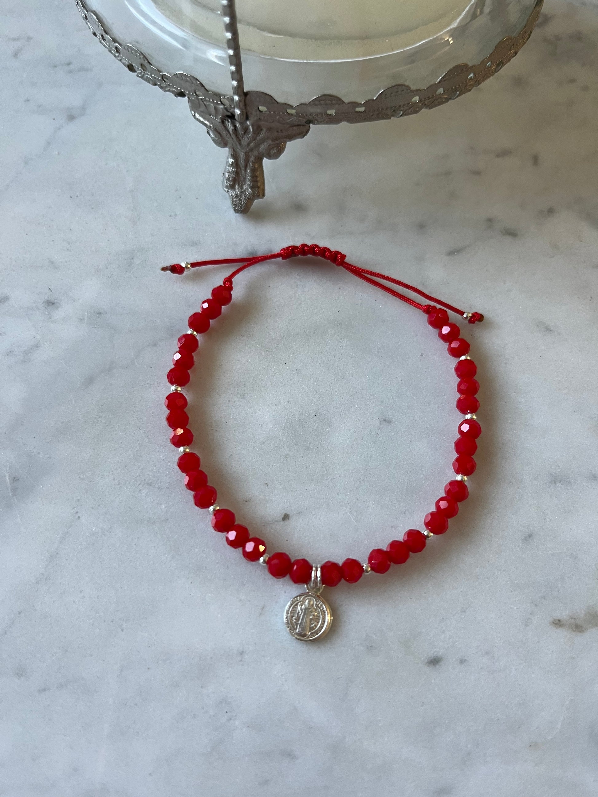 Diseñada para proteger y acompañar. Esta pulsera artesanal combina cristales rojos con detalles plateados y una medalla de San Benito en plata, símbolo de protección frente a las malas energías y guía espiritual.