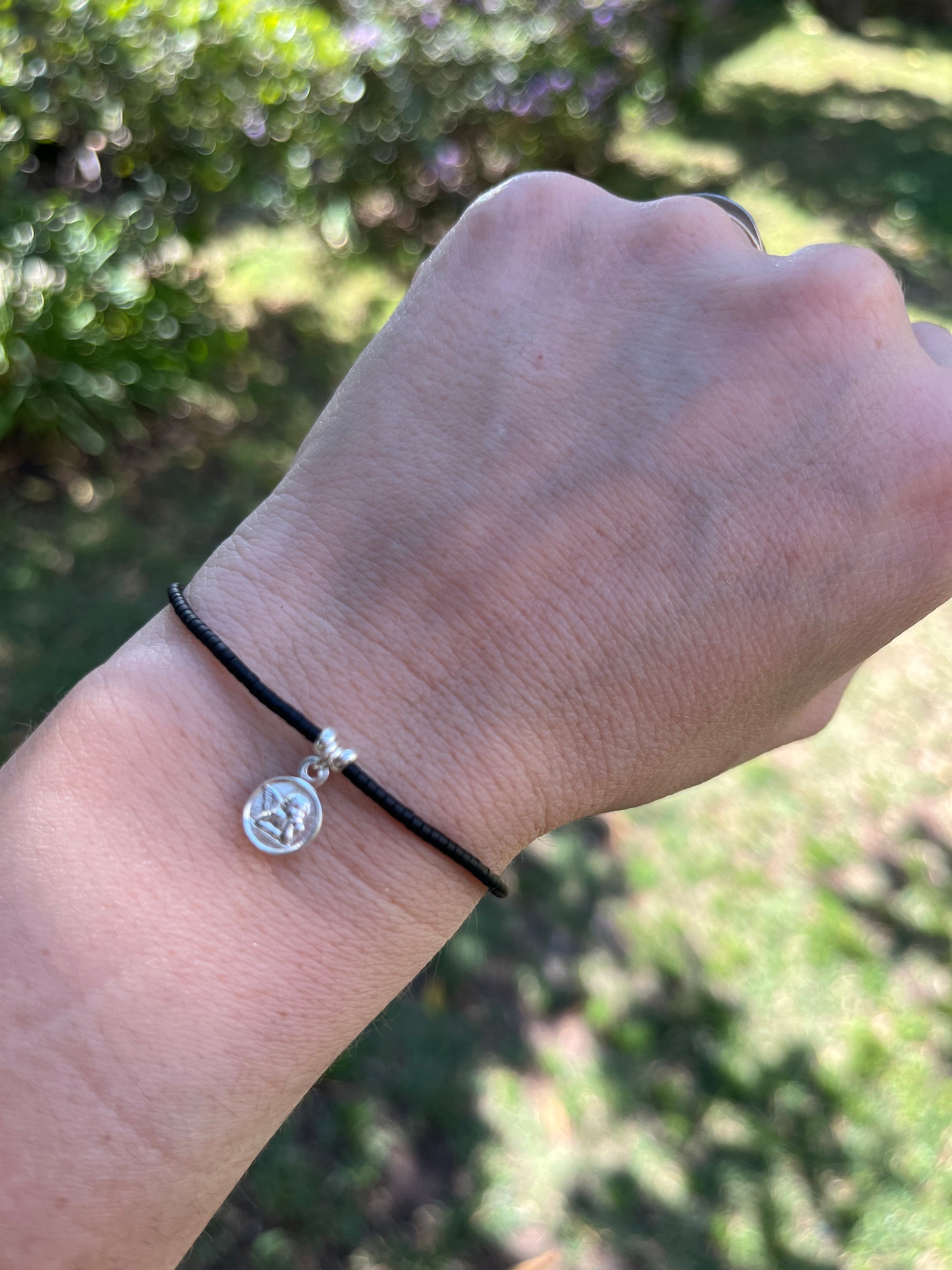 Diseñada con hilo negro y un dije del Ángel de la Guarda en plata real, símbolo de protección, compañía y amor que trasciende el tiempo.