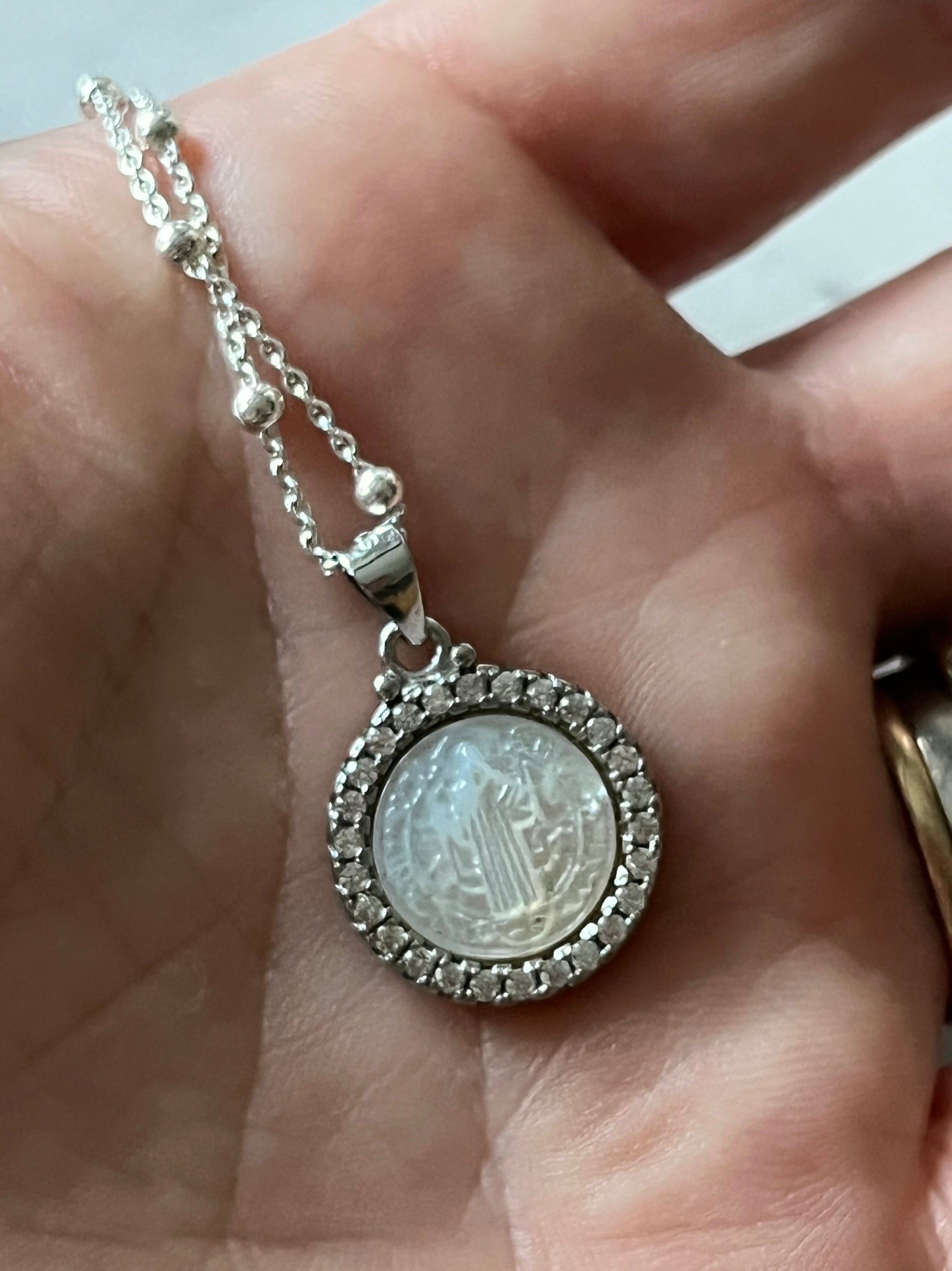Un amuleto de protección y fe. Este dije en plata destaca por su delicado centro de nácar con la imagen de San Benito, rodeado por un brillo sutil de circones que realzan su diseño. Ideal para llevar siempre contigo como símbolo de luz, resguardo y estilo.