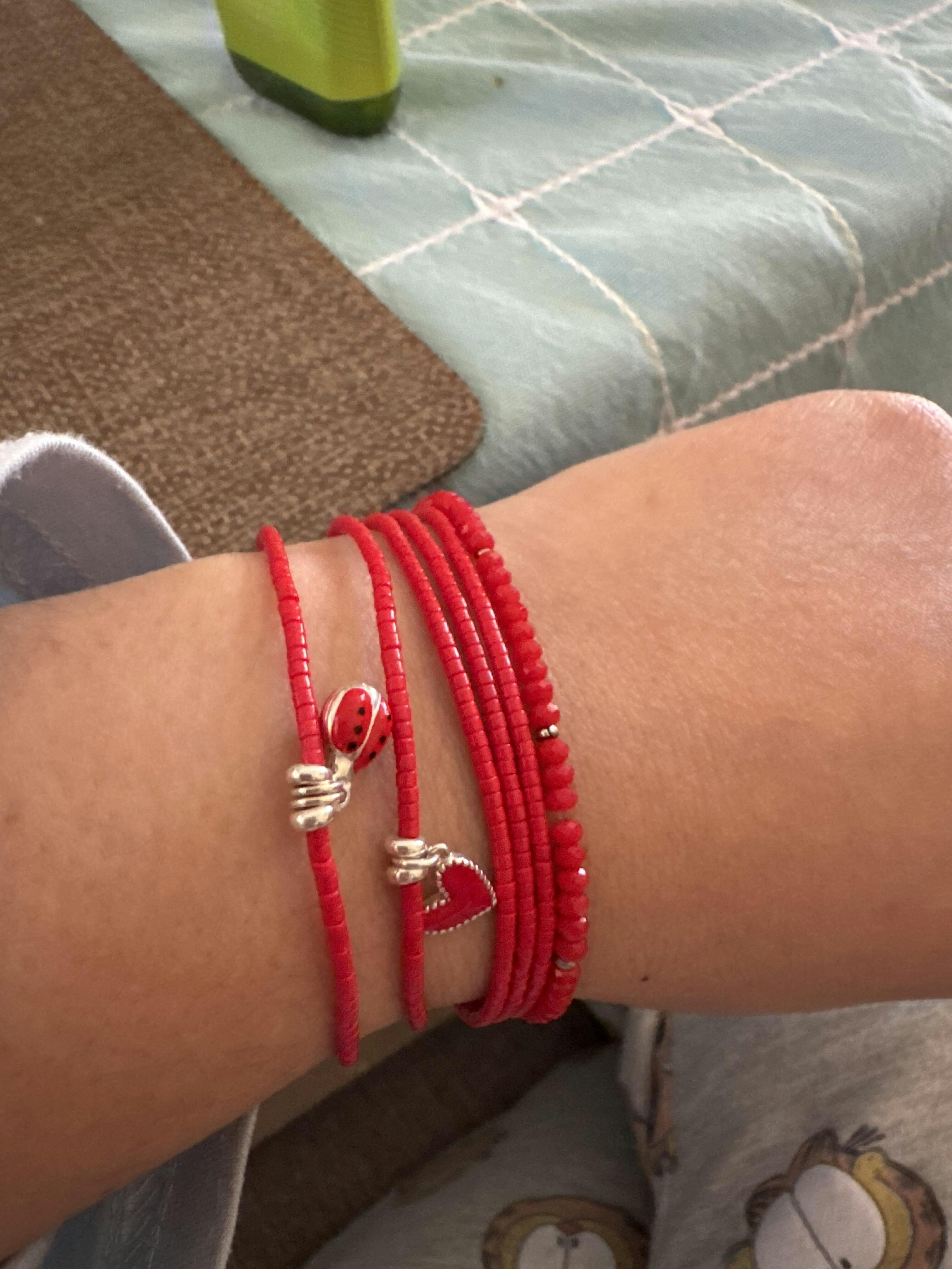 Cada una está tejida a mano con mostacillas finas rojas, representando fuerza interior, conexión y resguardo frente a las malas energías.